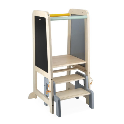 Učící věž pro pomůže dětem od 18 měsíců objevovat svět dospělých. Věž má tři schůdky, na jedné straně je tabule na kreslení křídou. Věž umožní dětem dostat se do výšky při každodenních činnostech – v kuchyni i v koupelně. Ulehčí dětem rozvoj motoriky, samostatnosti a interakce se svým okolím.