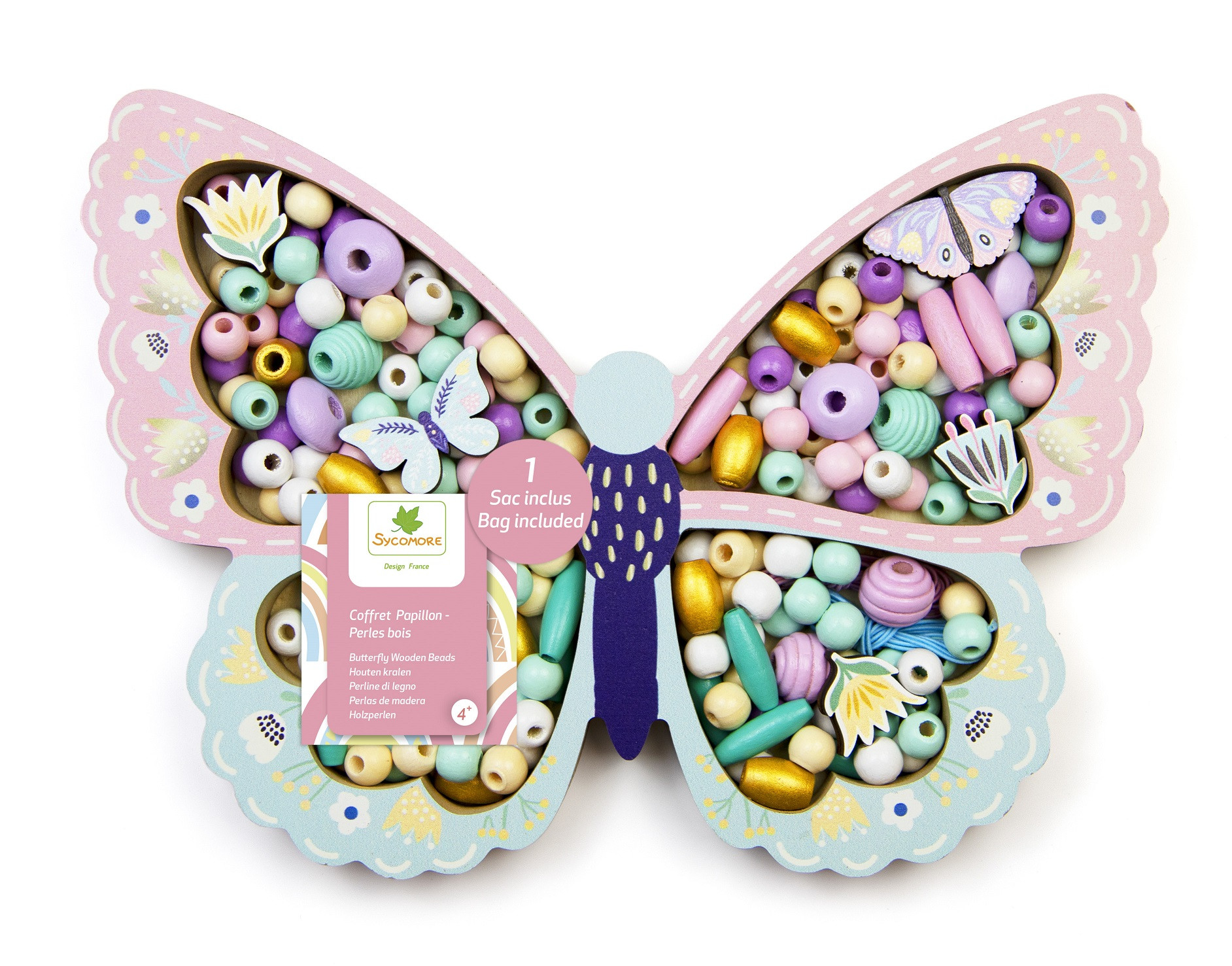 V atraktivním balení najdete dřevěné korálky v pastelových a zlatých barvách, 4 květinové korálky, 4 přívěsky ve tvaru motýlků, 3 metry provázku, organzový sáček na uložení korálků.