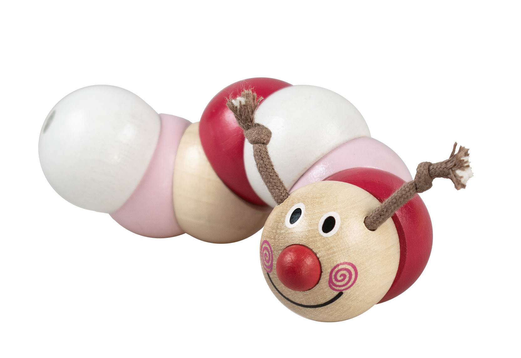 Hračka z barevných dřevěných perlí navlečených na gumě, které se pohybují, točí a ohýbají. Vhodná k procvičování jemné motoriky rukou Vašich dětí již od 6 měsíců. Hračka je zdravotně nezávadná, její délka je 13 cm, je připevněna na ekologické papírové kartě.
