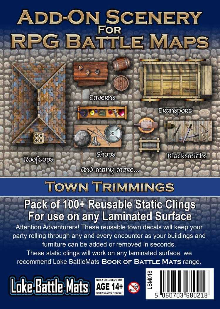 Doplňkové scenérie pro RPG mapy - Town Trimmings je balení více než 100 opakovaně použitelných statických polepů pro použití na jakékoli laminované mapě nebo povrchu. Tyto opakovaně použitelné prvky města a hostince vám umožní okamžitě přidat na vaše setkání nábytek, vybavení obchodů, bary a nábytek hostince a mnoho dalších prvků! Toto balení obsahuje také střešní díly, které vám umožní zakrýt stávající místnosti nebo vytvořit vlastní rozvržení města na obyčejné podložce.