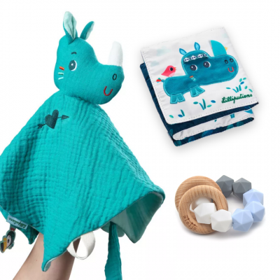 Sestavili jsme pro vás výhodný balíček se třemi produkty, které se stanou nerozlučnými kamarády vašeho miminka. Muchláček nosorožec Marius, první látková knížka a kousátko.
