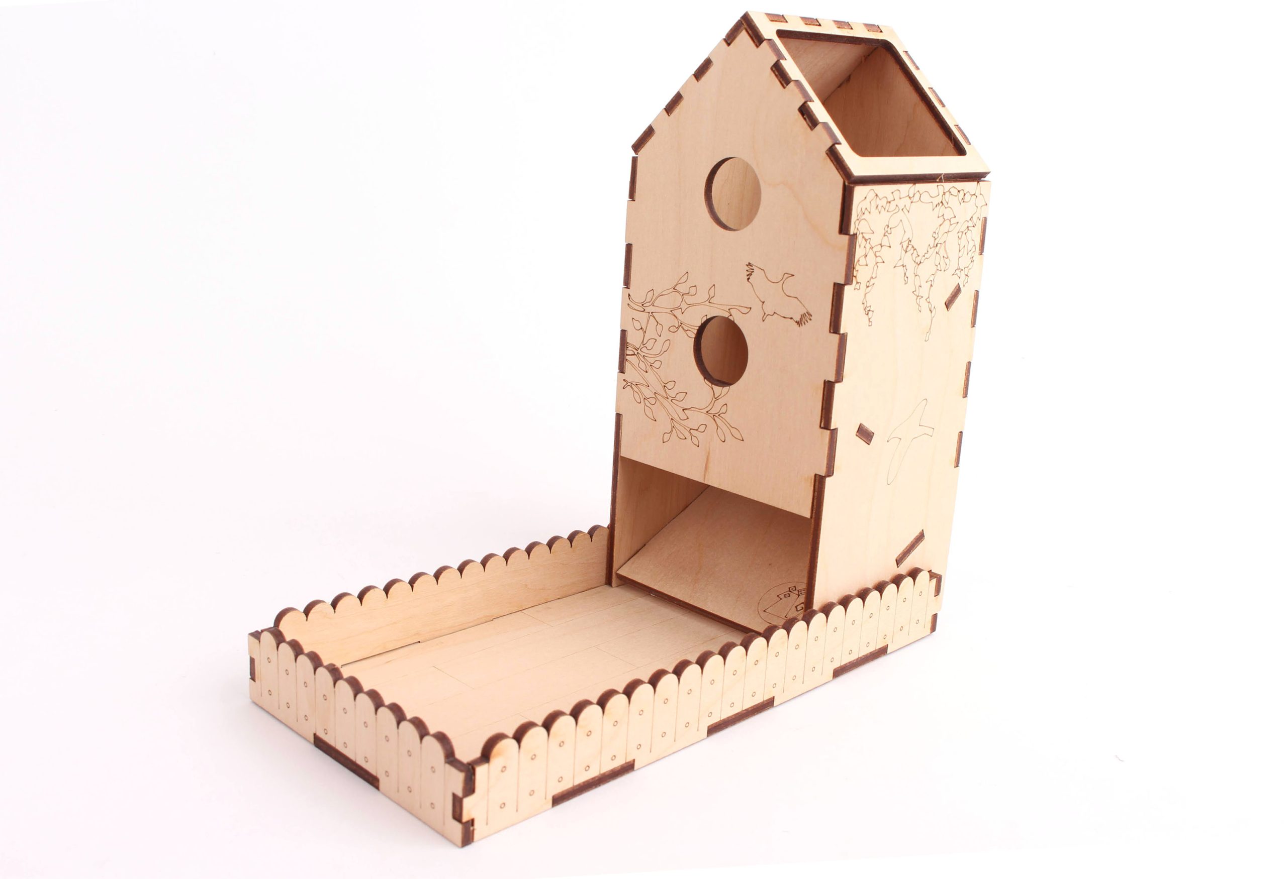 Budka je vyřezána z bukové překližky, dodávána je ve složeném stavu.