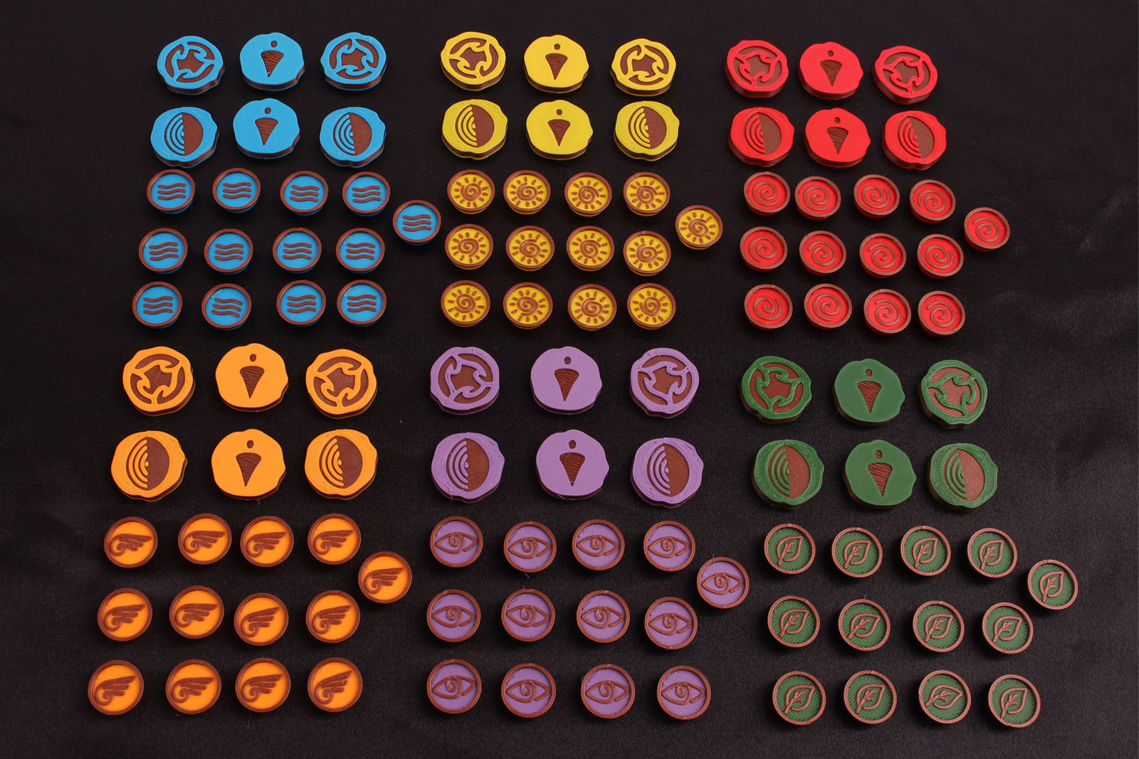 Základní sada: 76 žetonů ve 4 barvách (13 žetonů přítomnosti, 3 oboustranné žetony krátkodobých efektů a 3 oboustranné žetony izolace pro každého ze 4 hráčů)