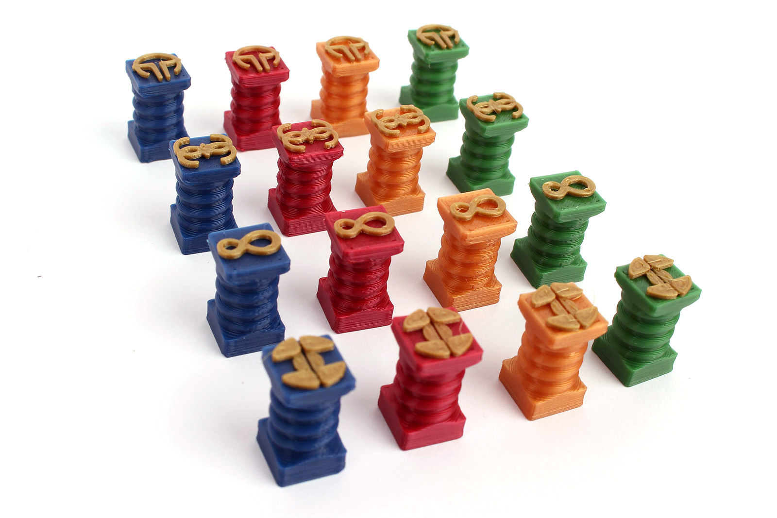 Ukazatele vlivu na stupnice frakcí Bene Gesserit, Kosmické gildy, Fremeny a Imperátora. Žetony nahrazují původní dřevěné kostičky.