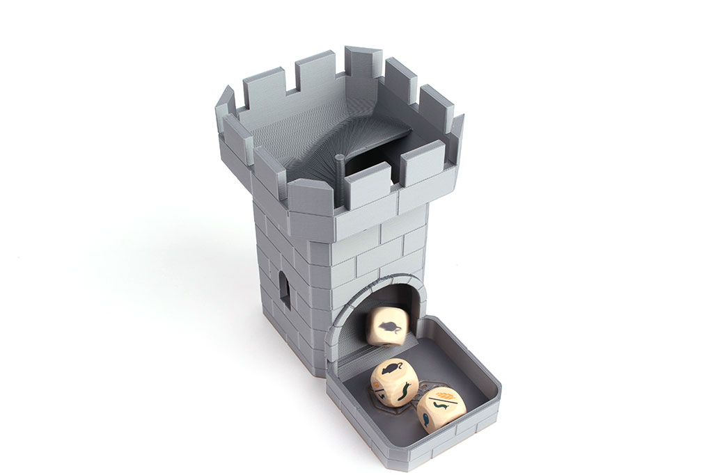 Házecí věž ve tvaru hradu, velká varianta pohodlně pojme i větší kostky (malá je pro klasické kostky velikosti 16mm). Házení je zábavné zejména pro menší děti a rodičům ušetří nahánění kostek po podlaze.