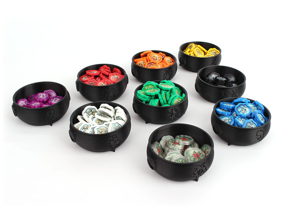 Tato větší varianta kotlíků je určena pro vylepšené žetony GeekUp Bits nebo žetony s kryty. GeekUp bits (základ i rozšíření) se vejdou do kotlíků s rezervou a dají se snadno uzavřít víkem. Žetony s kryty se také do kotlíků vejdou a dají se uzavřít víkem, ale v případě nejpočetnějších zelených žetonků (58ks s rozšířením) to je opravdu natěsno a je třeba počítat s trochou snahy při přerovnávání.