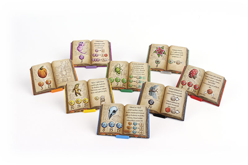 Tématické držáky na destičky knih, odpovídající původnímu barevnému provedení pro lepší přehled při hraní. Alternativa víček na kotlíky.