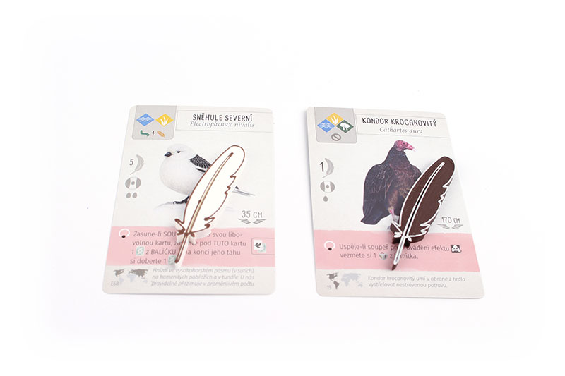 Žetony ve tvaru pírka v bílé nebo hnědé variantě do hry Na křídlech. Slouží jako označení použité karty s růžovým efektem.