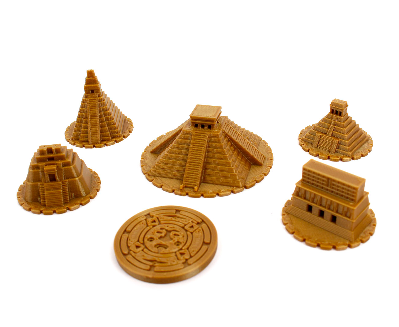 Modely chrámů Tikal, Chichén Itzá, Uxmal, Yaxchilán, Paleque a reliéf na kolo kalendáře pro hru Tzolkin: Mayský kalendář.