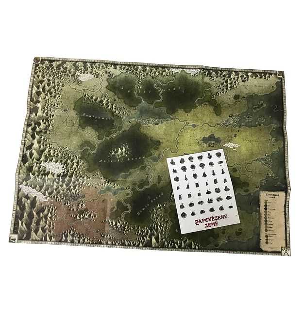 Sada obsahuje velkou barevnou oboustrannou hexovou mapu pro hru na hrdiny Zapovězené země a list samolepek s dobrodružnými místy a náhrobky, s jejichž pomocí proměníte herní mapu v žijící, nadčasový záznam svých dobrodružství. Rozměr mapy je 49 x 69 cm.
