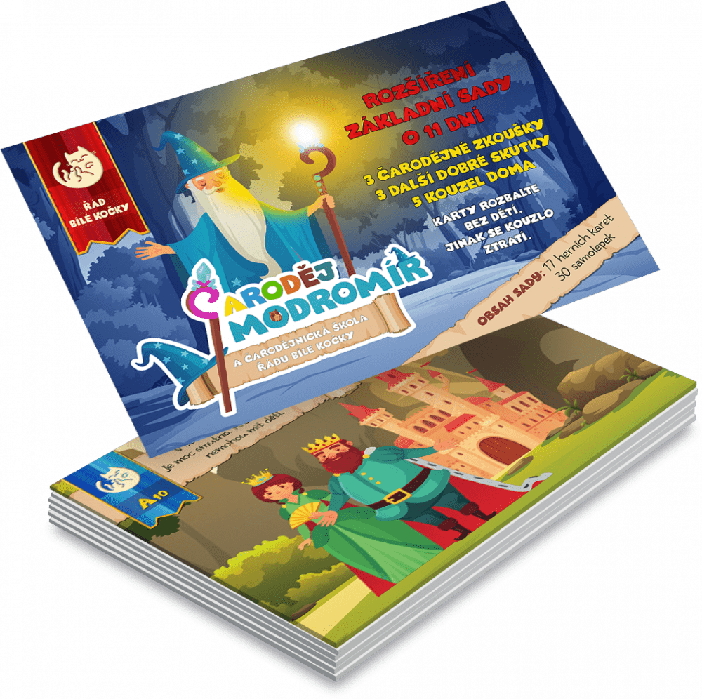 Čaroděj Modromír a Čarodějná škola řádu bílé kočky je originální hra pro děti od 3 do 8 let. Děti se v ní vydají do kouzelného světa a jejich průvodce, čaroděj Modromír, jim v něm připraví řadu úkolů. Budete například sbírat ingredience v přírodě a vařit lektvary, za odměnu lepit samolepky na karty... Za splnění úkolů budou děti odměňovány pokrokem v příběhu. Čaroděje Modromíra nebudete hrát u stolu, ale budete s jeho pomocí trávit s dětmi čas trochu jinak. Uvidíte, že se do tohoto kouzelného světa zamilují!
