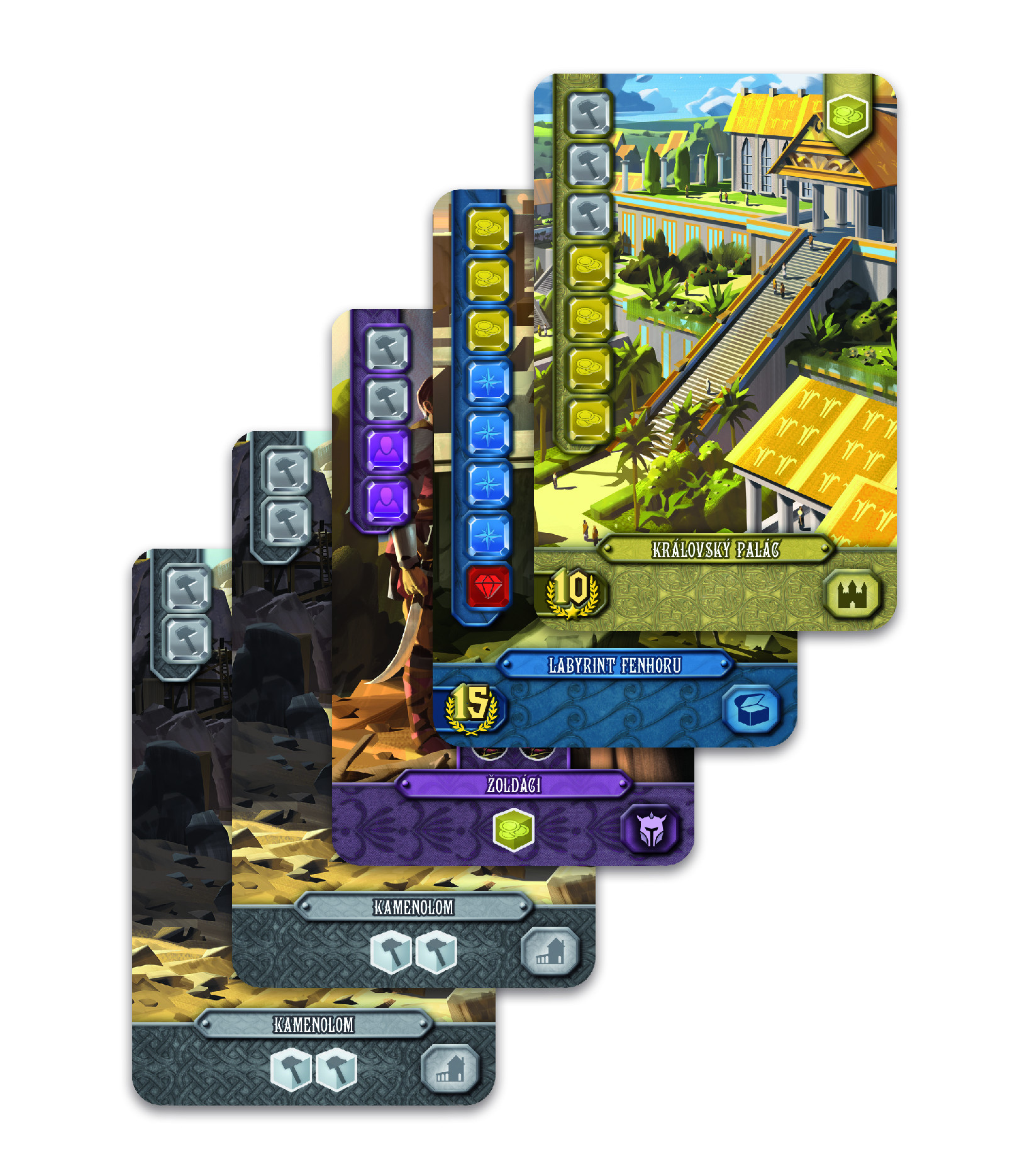 Konkrétně jde o karty Žoldáci, Královský palác, Labyrint Fenhoru a 2 karty Kamenolomu.